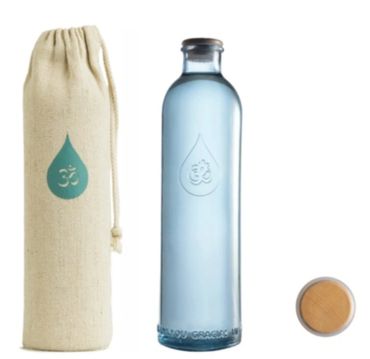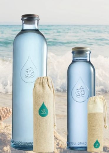 We carry two kinds of Om Water bottles. Om Mini - Regular Size at 501ML and the Om Flying Gratitude - Extra Large Size at 1.23 ML. Unlike any other water bottle, Om Water bottles are true works of art. Both come with a carrying sleeve made with hemp and cotton. Made for easy carry around and on the go. With an Air tight cap, ensuring water stays in place. Om water designs and develops it's own products based on three fundamental pillars: Design, Ecology and Spirituality. Using ancient geometry to create a hand blown, lead free, 100% recyclable blue bottle that changes the structure of water and it's vibration.